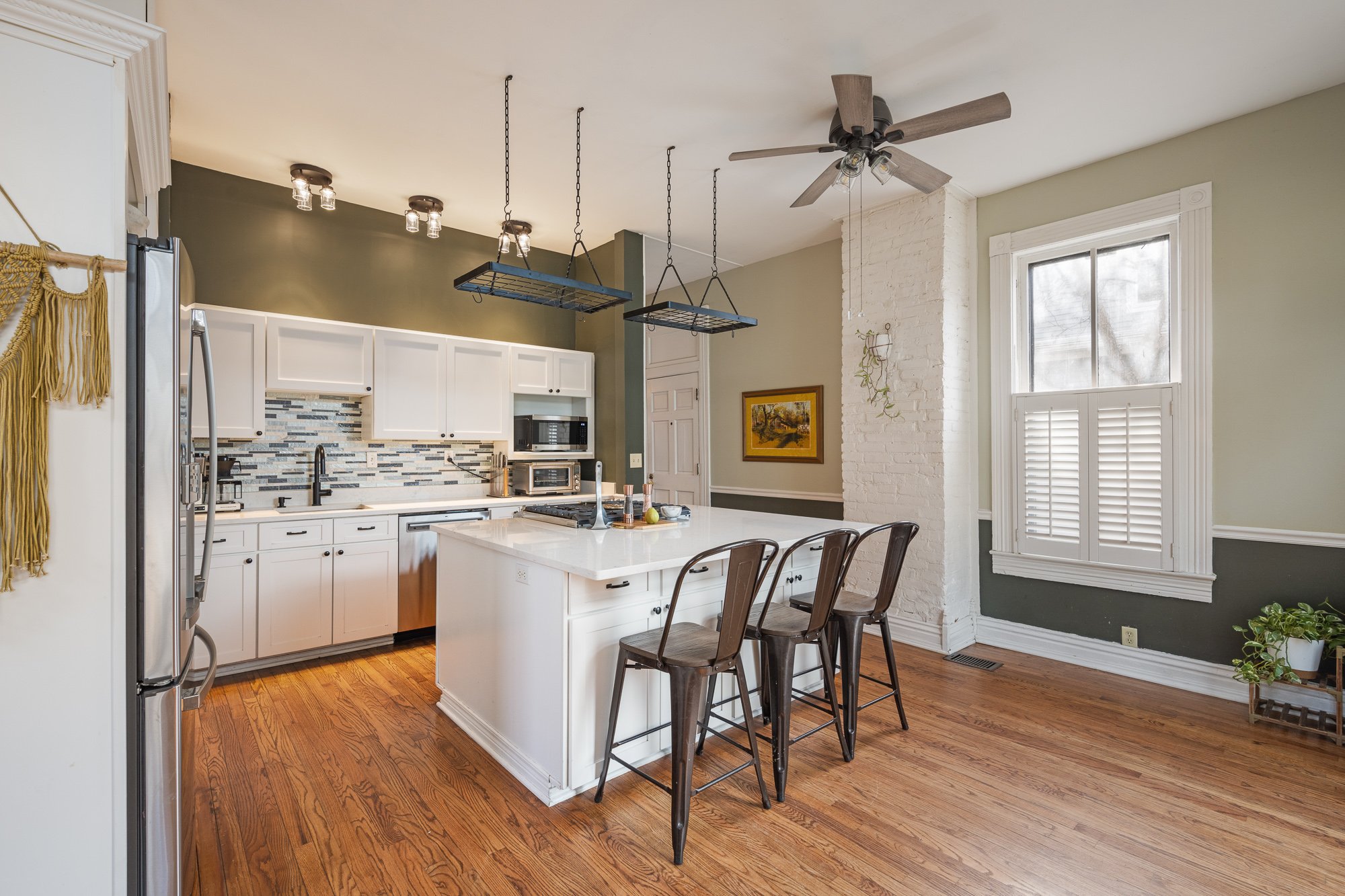 Historic character with everyday livability AND large lot! This beautifully maintained Old Louisville home offers spacious living in a convenient location with generous outdoor space. From the moment you arrive, the classic facade and inviting front porch set the tone. Inside, you’ll be welcomed with an impressive foyer, warm hardwood floors, tall ceilings, original fireplaces, and gracious room proportions that reflect the craftsmanship of the era (even original pocket doors between foyer/living, and living/dining!). The oversized kitchen is a great space with an amazing view of the backyard and side yard space, creating an ideal setting for both quiet evenings and lively gatherings. Additionally, the walk in pantry offers ease and convenience for storage.